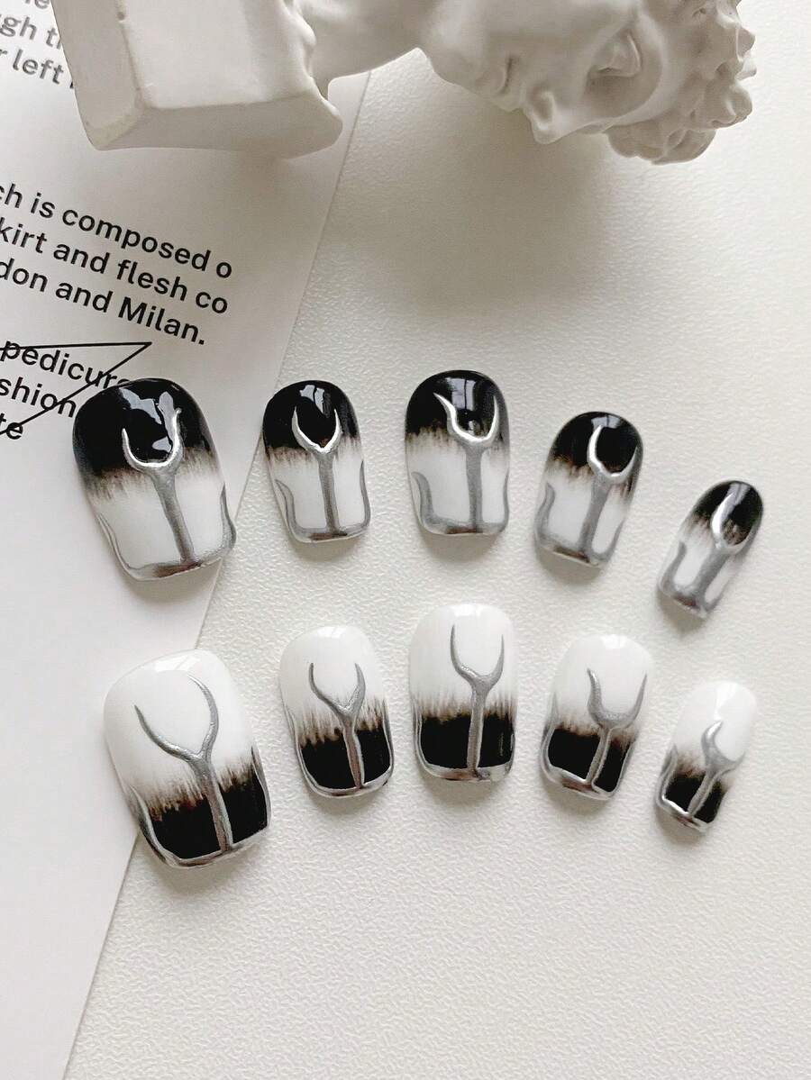 10 Pieces Of Hand Pressed Square Nails, Summer Nail Art, Beautiful Fake Nails, DIY, Halloween, Silver Striped Nail Accessories Black And White Nail Sequins, Reusable Nail Art Supplies For Girls And Ladies In Weddings, Parties, Holiday Scenes, Gift A Nail Kit