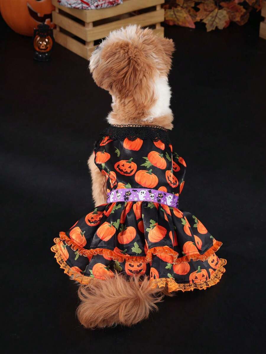 1pc Pumpkin Lace Pet Dress, Halloween Themed Pet Apparel, Two-Layer Pet Skirt For Dogs & Cats