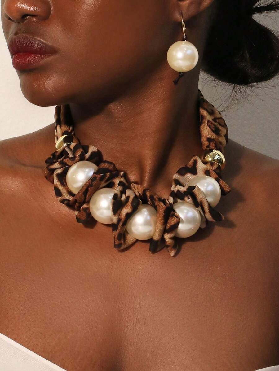 3pcs/Set Beaded Fabric Leopard Print Faux Pearl Circle Necklace & Earring Jewelry Set, Suitable For Women's Evening Party, Gathering, Vacation And Daily Wear