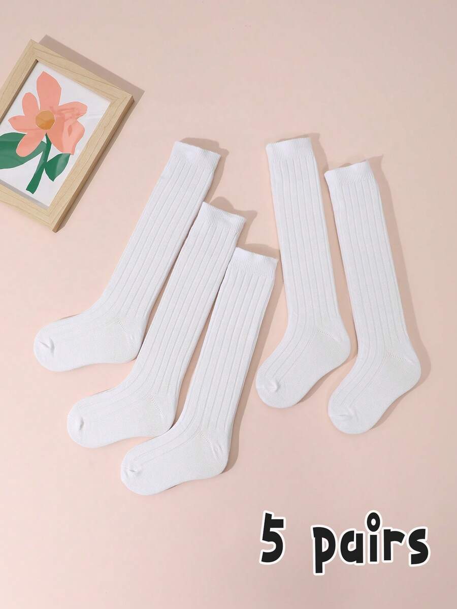 5 Pairs Girls Ribbed Knee High Socks, White Everyday Versatile Socks For Girls