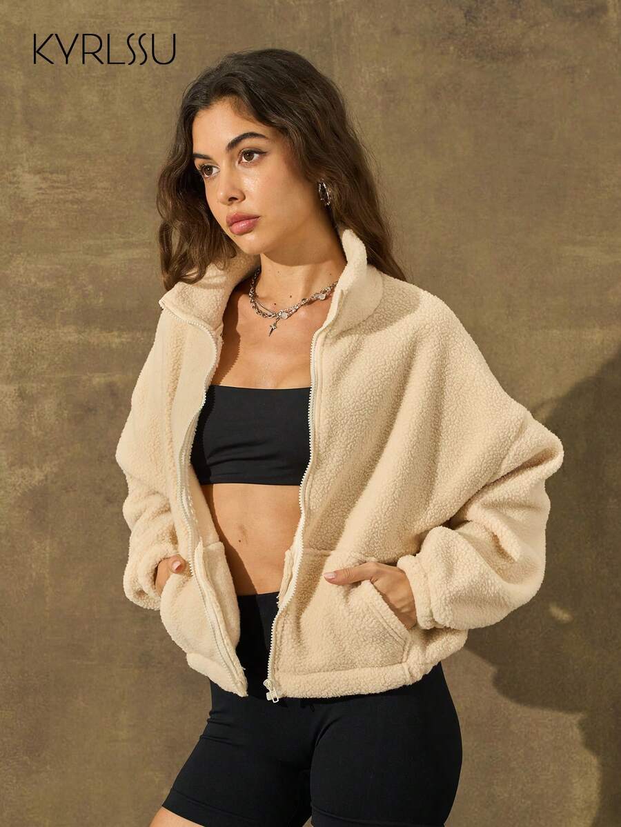 KyrLssu Women's New Autumn/Winter Fleece-Look Cropped Stand-Collar Coat: Stylish, Loose-Fit, Warm Zip-Up Cardigan With A Designed Feel,British Style,Commute Wear,Office Attire,Urban Trendsetter,Casual Top