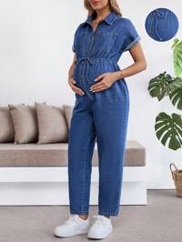 SHEIN MaternitySHEIN Pregnant Women Blue Denim Short Sleeve V-Neck Jumpsuit, Suitable For Parties, Holidays, Dates, Valentine's Day, Afternoon Tea,