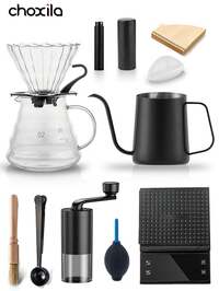 choxilachoxila 4/8/9/12pcs Coffee Set, V02 Drip Coffee Maker Kit, Coffee Brewing Set, Suitable For 2-4 Cups, Includes 600ml Drip Coffee Pot, V02 600ml Coffee Sharing Pot, Coffee Grinder, Cleaning Brush And Digital Scale. Ideal For Afternoon Tea, Family Gatherings, Camping, And A Great Gift For Coffee Lovers. Electric Milk Frother, Powerful Handheld Milk Frother, Mini Milk Frother, Coffee Stirrer, Stainless Steel Drink Mixer, Suitable For Coffee, Latte, Cappuccino, Matcha, Hot Chocolate, Portable Milk Frother, Cordless Electric Milk Frother Mini Coffee Maker