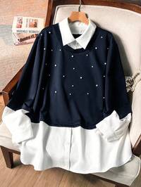Lacomfia סווטשירט לנשים 2 ב-1 עם שרוולים ארוכים, עיצוב פנינים צבעוני, קז'ואל נוח, מינימליסטי, שיק, מידות גדולות