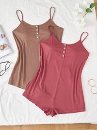 SHEIN 2pcs Plus Size Rib-Knit Camisole One-Piece Pajama Set