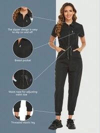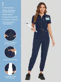 cimmuovere Zip Front Short Sleeve Tie Waist Casual Scrubs Nurse Scrubs Workwear Dentist Healthcare Pet Hospital Laboratory Jumpsuit