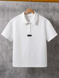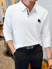YozikSHEIN Teen Boys' White Simple Silhouette Tipped Collar Contrast Horse Logo Print Polo Shirt, Casual, Academic, Comfortable, Versatile, Soft Fabric, Suitable For Daily Wear, School, Outings, Outdoor Sports, Autumn/Winter, Parties, Formal Occasions, Back To School