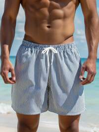 SHEIN Teen Boys' Blue Striped Beach Swimming Trunks - Comfortable, Fashionable, Versatile, Soft, Suitable For Daily, Sports, And Beach Vacation