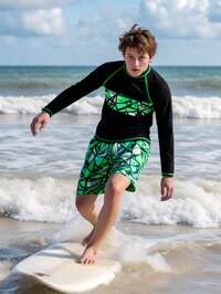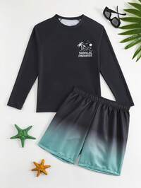 SHEIN Teen Boys' Casual Patchwork Tropical Print Long Sleeve Rash Guard Shirt With Boxer Briefs Swim Shorts