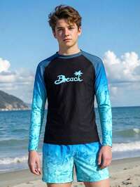 Teen Boys Letter Print Long Sleeve Top & Shorts Swimwear Set, For Summer, Beach, Vacation Swim Wear For Teen Boys Teen Boy Vacation Outfits Vacation Outfits Teen Boy Teen Boys Vacation Outfit Swimwear For Teen Boys Set
