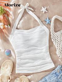 SHEIN Teen Girls Vacation, Summer, Stylish Halter Tie Knot Hem Slit Open Back Camisole Tank Top, Vacation Mini Halter Polka Dot Bubble Sleeve A-Line Side Slit Camisole, Pastel Yellow, Color, Valentine's Resort Style Mustard Black Textured Tube Top With Front Twist, Frill Trim Fitted Blouse. Suitable For Afternoon Tea, Streetwear, Vacation, Layering Or Party Wear, Autumn/Winter/Cute/Vacation
