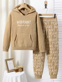 2pcs Boys Korean Style Autumn Winter Oversized Hooded Sweater & English Text Knit Pants Set