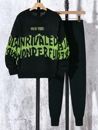 SHEIN Tween Boys' Contrast Color Round Neck Ribbed Sweater And Sweatpants Set