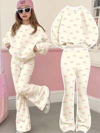 Leap CrewSHEIN Leap Crew 2pcs/Set Cream White & Cream Pink Vintage Mini Bow Decor Casual Loose Fit Thick Crew Neck Sweatshirt And Flare Pants Set, Suitable For Autumn/Winter, Tween Girls Outfits For , Easy Comfort, Autumn Layers, Stylish, Casual Wear, Kids Graphic Clothes, Back To School, Fall Clothes, Homecoming #3 Bestseller