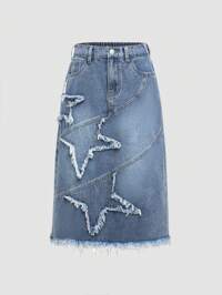 ChillGRLSHEIN ChillGRL Tween Girls Denim Skirt, Spring/Summer New Arrival, Light Blue Denim, Y2K Style, Heart Embroidery, Front Slit, Fitted, Comfortable Cotton Denim, Suitable For Daily Wear, School, And Commute Aesthetic Clothes For Girls Denim Skirt Set #7 Bestseller