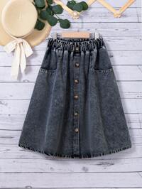 Tween Girls' Denim Skirt, Cute & Sweet Casual Fashion Recommendation! Classic Blue Washed Denim Fabric, Front Pockets + Bow Decor Adorable And Lively, Elastic Waistband + Fake Chain Design, Easy To Put On And Take Off, Pleated Hem Flattering Leg Shape, Suitable For Daily Outings, Campus Casual, Weekend Trips, Back To School Season, Vacations, Etc. Let Your Child's Every Day Be Filled With Fashion And Vitality!