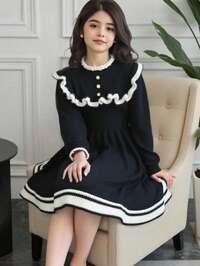 SHEIN Girls' Sweater Dress, Fashionable & Elegant Bowknot Puff Sleeve Dress, Casual Solid Color Ruffle Hem Round Neck Long Sleeve Dress, Academic Style, Everyday Wear, Autumn/Winter, Girls' Knitted Dress, Black & White Children's Clothing, Girls' Autumn Dress, Kids' Knit Dress, Girls' Princess Style Ruffle Hem Dress Long Sleeve Kids Dress Girl Clothes Autumn And Winter Clothes Girls Spring Autumn French Style Dress Dress Kids Girl Peter Pan Collar Dress Girl Long Sleeve Dresses Girls Bow Dress Girls Winter Dress Girls White Dress Girls Spring Dress