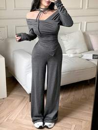 Modelyn CURVEabyoxi Women's Dark Gray, Neck Tie-Front, Long Sleeve Off-Shoulder, Cross-Over Wrap, Ruched Slim-Fit Waist, Asymmetrical Hem Top And Elastic Waistband Wide-Leg Pants, Stretch Knit 2 Piece Set, Casual Simple, Elegant Vintage, For Everyday Outings, Social Party, Date, New Year, Valentine's Day, All Season Outfits #1 Bestseller