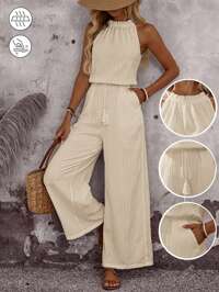 EMERY ROSE Summer Vacation Casual Solid Color Halter Jumpsuit