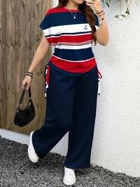 EMERY ROSE Back To School Music Festival Casual Minimalist Collegiate Nautical Red & Blue Striped Pattern Plus Size 2 Pieces Set, Suitable For Summer-Autumn Transition,Spring/Vacation