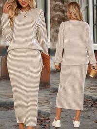EMERY ROSE Women's Casual Striped Crew Neck Long Sleeve Top And Skirt 2-Piece Set, Autumn Omen's Full Print Round Neck Long Sleeve High-Low Hem Top And Skirt Loose 2 Pieces Set Two Pieces Set Women Blouse And Skirt Set Women Ladies Casual Skirt Set Women Two Pieces Outfit Casual Suit 2pcs Summer Fall Women Clothes Fall Clothes For Women Fall Outfits Women Autumn Clothes Fall Outfits Autumn Winter Clothes For Women Winter Business Casual Woman Business Casual Outfits Women Country Country Outfits Women Old Money Basic Teacher Outfits For Women Going Out Tops Women Back To School Fall Women Clothes
