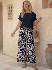EMERY ROSE Plus Size Summer Teacher Clothes Geometric Pattern Short Sleeve Top And Wide Leg Pants Two-Piece Set,Spring/Vacation
