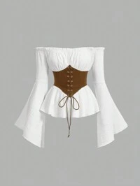SHEIN MOD Off Shoulder Lace Up Front Ruched Bust Ruffle Hem White Waisted One-Shoulder Bell Sleeves Blouse,Long Sleeve Tops