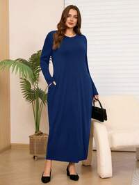 RosumiRosumi Plus Size Women's Round Neck Long Sleeve Black Dress With Pockets, Autumn/Winter,Vacation Outfits Women ,Holiday Outfits For Women,Spring Outfit Women,Valentine's Day ,Valentine Outfits For Women ,Going Out Outfits,2026 New Clothes,Simple And Fashionable For Everyday Wear,Early Spring